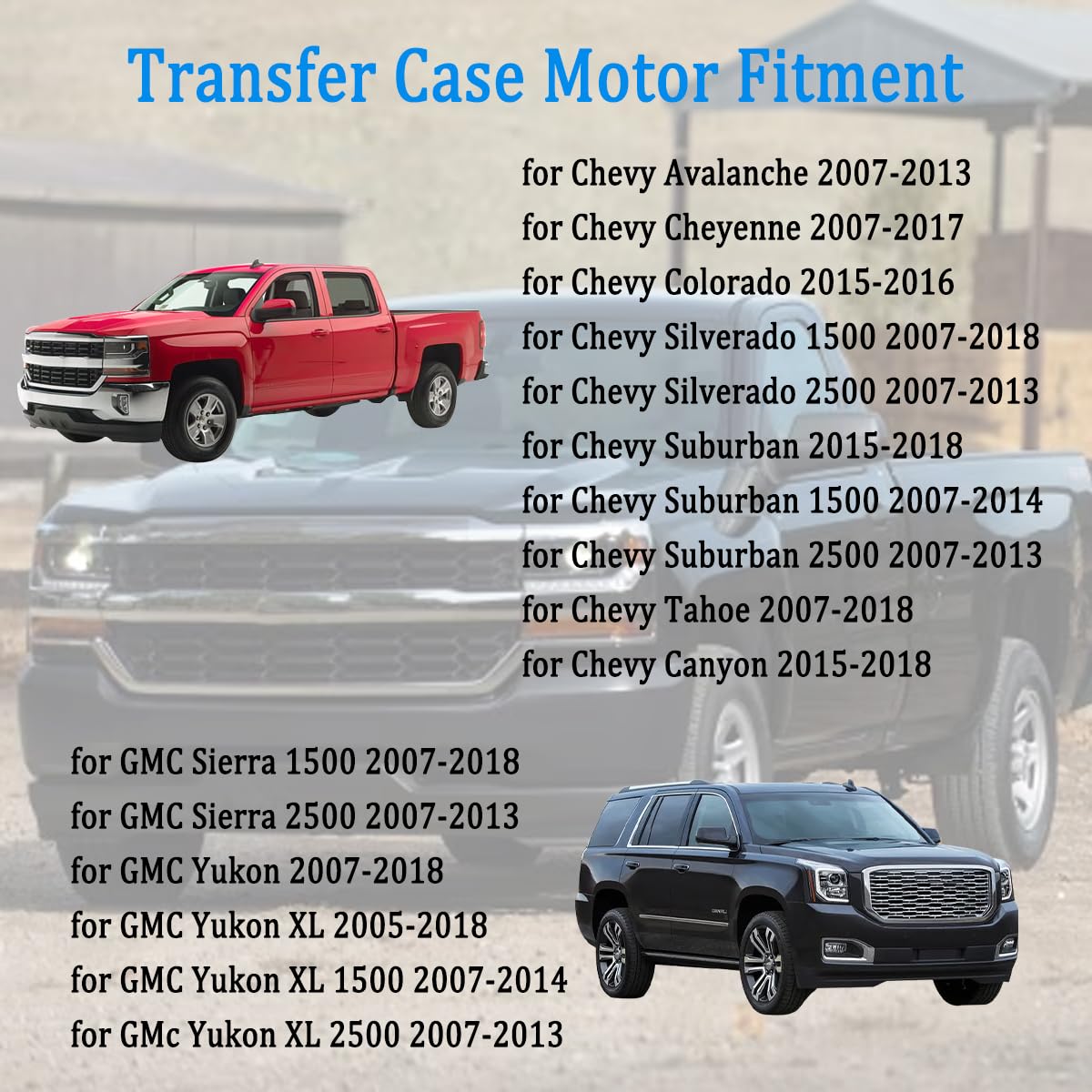Fit for ChevroletAvalanche: 2007, 2008, 2009, 2010, 2011, 2012, 2013Fit for ChevroletCheyenne 2500: 2012, 2013Fit for ChevroletCheyenne: 2007, 2008, 2009, 2010, 2011, 2012, 2013, 2014, 2015, 2016, 2017Fit for ChevroletColorado: 2015, 2016Fit for ChevroletSilverado 1500: 2007, 2008, 2009, 2010, 2011, 2012, 2013, 2014, 2015, 2016, 2017, 2018Fit for ChevroletSilverado 2500 HD: 2007, 2008, 2009, 2010, 2011, 2012, 2013Fit for ChevroletSilverado 2500: 2007, 2008, 2009, 2010, 2011, 2012, 2013Fit for ChevroletSuburban 1500: 2007, 2008, 2009, 2010, 2011, 2012, 2013, 2014Fit for ChevroletSuburban 2500: 2007, 2008, 2009, 2010, 2011, 2012, 2013Fit for ChevroletSuburban 3500 HD: 2016, 2017Fit for ChevroletSuburban: 2014, 2015, 2016, 2017, 2018Fit for ChevroletTahoe: 2007, 2008, 2009, 2010, 2011, 2012, 2013, 2014, 2015, 2016, 2017, 2018Fit for GMCCanyon: 2015, 2016, 2017, 2018Fit for GMCSierra 1500: 2007, 2008, 2009, 2010, 2011, 2012, 2013, 2014, 2015, 2016, 2017, 2018Fit for GMCSierra 2500 HD: 2007, 2008, 2009, 2010, 2011, 2012, 2013Fit for GMCSierra: 2008, 2009, 2010, 2014, 2015, 2016, 2017Fit for GMCYukon XL 1500: 2007, 2008, 2009, 2010, 2011, 2012, 2013, 2014Fit for GMCYukon XL 2500: 2007, 2008, 2009, 2010, 2011, 2012, 2013Fit for GMCYukon XL: 2015, 2016, 2017, 2018Fit for GMCYukon: 2007, 2008, 2009, 2010, 2011, 2012, 2013, 2014, 2015, 2016, 2017, 2018Fit for CadillacEscalade ESV: 2016, 2017, 2018Fit for CadillacEscalade: 2016, 2017, 2018