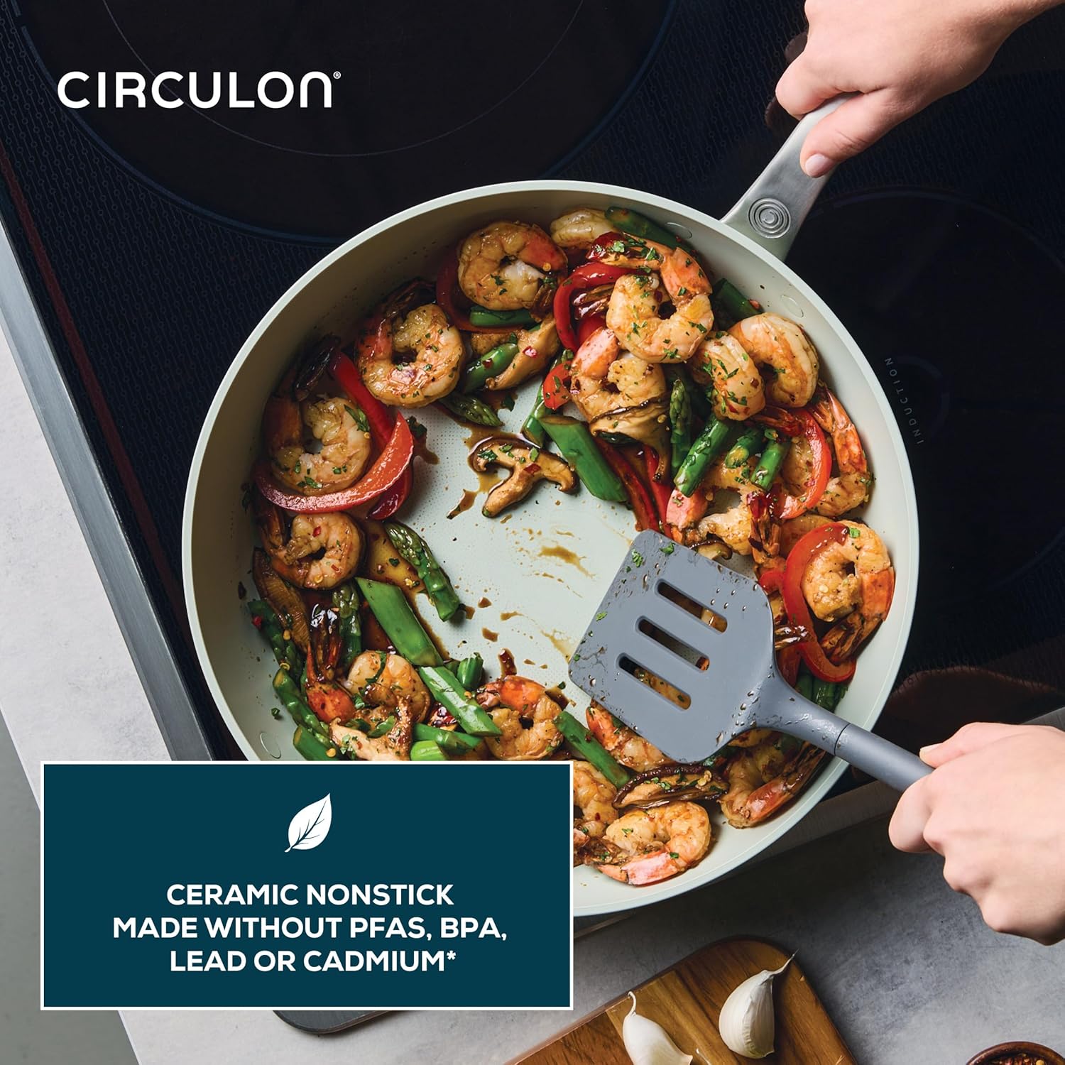 Only Circulon could make ceramic this tough. From America’s #1 premium nonstick cookware brand comes Circulon Halo with LaserDefense ceramic nonstick, a revolutionary nonstick surface engineered for endurance and made without PFAS, BPA, lead, or cadmium*. When it comes to resisting chips, cracks, flakes, abrasions, and stains, Halo is 6x more stain resistant, 9x more scratch resistant, and has 50% longer-lasting nonstick release than the ceramic nonstick competition**. Created to withstand extreme cooking conditions from high heat and hot oil to burnt-on food and metal utensils, our unique LaserDefense nonstick features a tough, heat-conductive aluminum core that is laser-etched with a circular pattern of raised microscopic dots to strengthen its ceramic nonstick surface. This fusion of laser technology and Circulon’s signature circular pattern delivers exceptional durability and effortless food release that truly stands up to everyday use. This 5-Quart Sauté Pan features thick aluminum construction for fast, even heating, flush rivets for effortless stirring and cleanup, and a silicone-rimmed glass lid that locks in steam and flavor. A helper handle on this sauté pan offers extra comfort and control. It’s oven-safe to 500 F (350 F for lid), dishwasher-safe, and induction compatible. And with a statement-making monochromatic finish, Circulon Halo is proof that high-performance nonstick cookware doesn’t have to blend in. *Product design does not involve intentionally adding to the interior coating these materials, which may otherwise be present in the environment. **Than leading competitor ceramic nonstick in a food release test performed at 220 degrees C/430 degrees F, and leading competitor ceramic nonstick in staining and metal utensil tests performed at 200 degrees C/390 degrees F.