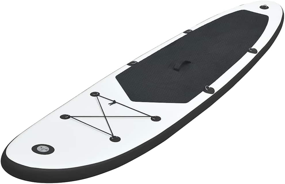 The SUP board is ideal for learning, recreational paddling and small wave riding with comfort and stability.Equipped with special high-pressure screw valves, it is easy and quick to inflate and deflate. Two pre-fixed fins and one removable fin are durable to withstand the pressures of paddling. A practical carrying bag is included for easy and fast transport. Our SUP board is designed with the perfect level of curve, enhancing its rigidity for a more stable ride. This board glides effortlessly through flat waters and rides smoothly in the surf. The inflatable SUP board is puncture-proof and UV proof and withstands extreme nautical conditions. Please note that this is designed for adults.Color: Black and whiteMaterial: PVC + EVAInflated dimensions: 118.1" x 28.3" x 3.9" (L x W x H)Fin size: 8.1" x 7.3" (L x W)Maximum number of persons: 1 adultMaximum load capacity: 198.4 lbMaximum working pressure: 12 psiPuncture-proof and UV proofDelivery contains:1 x Surf board (118.1")1 x aluminum oar (72.8")1 x Removable fin1 x High pressure hand pump with high pressure gauge1 x Repair kit: Glue & 3-ply patch1 x Carrying bagNote: This product is compatible with EN 15649California Proposition 65WARNING: California's Proposition 65