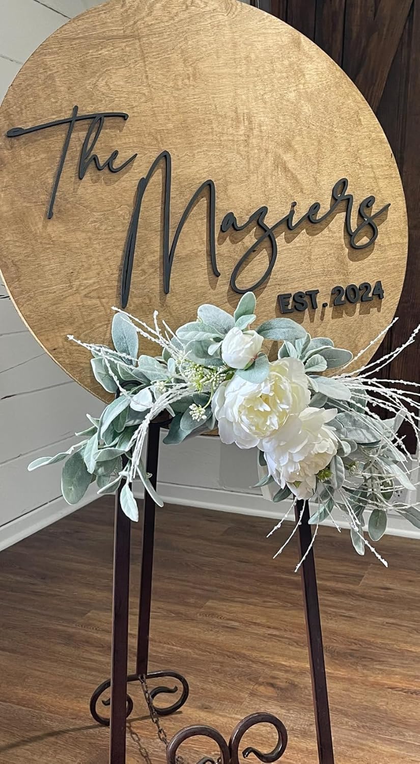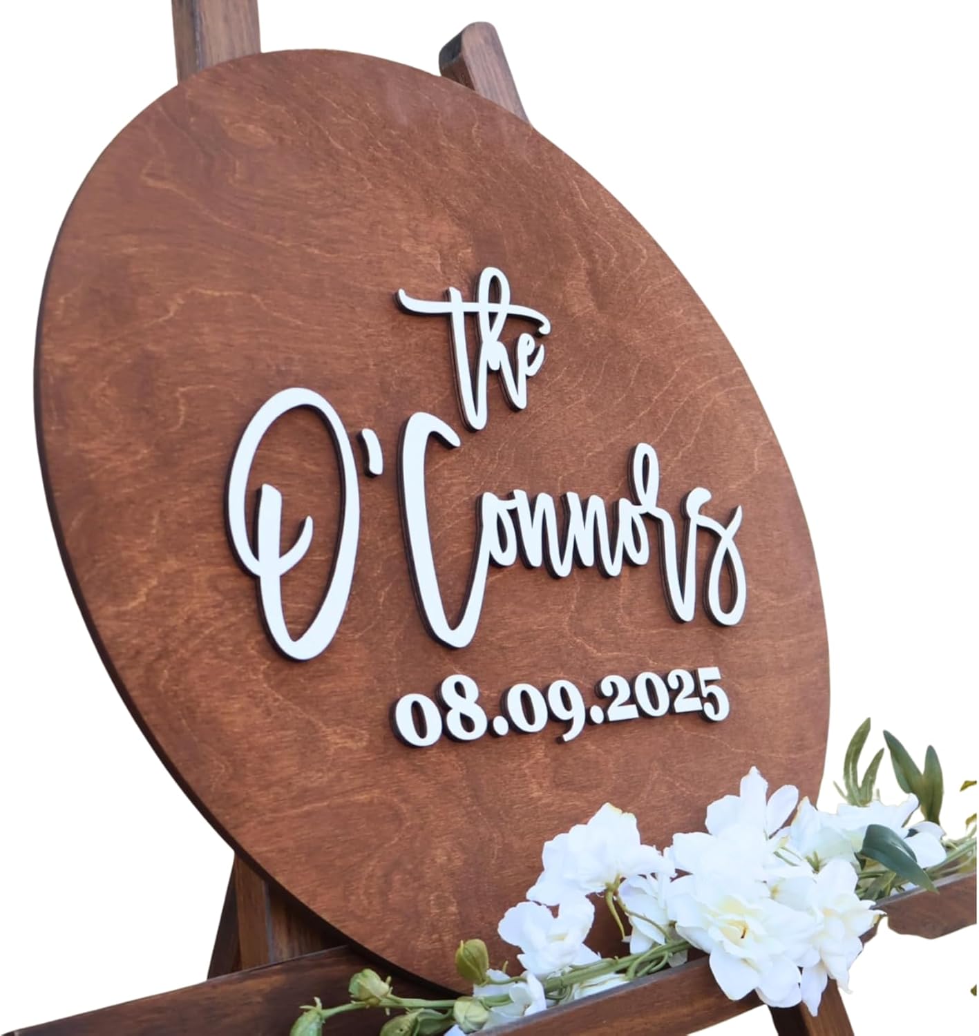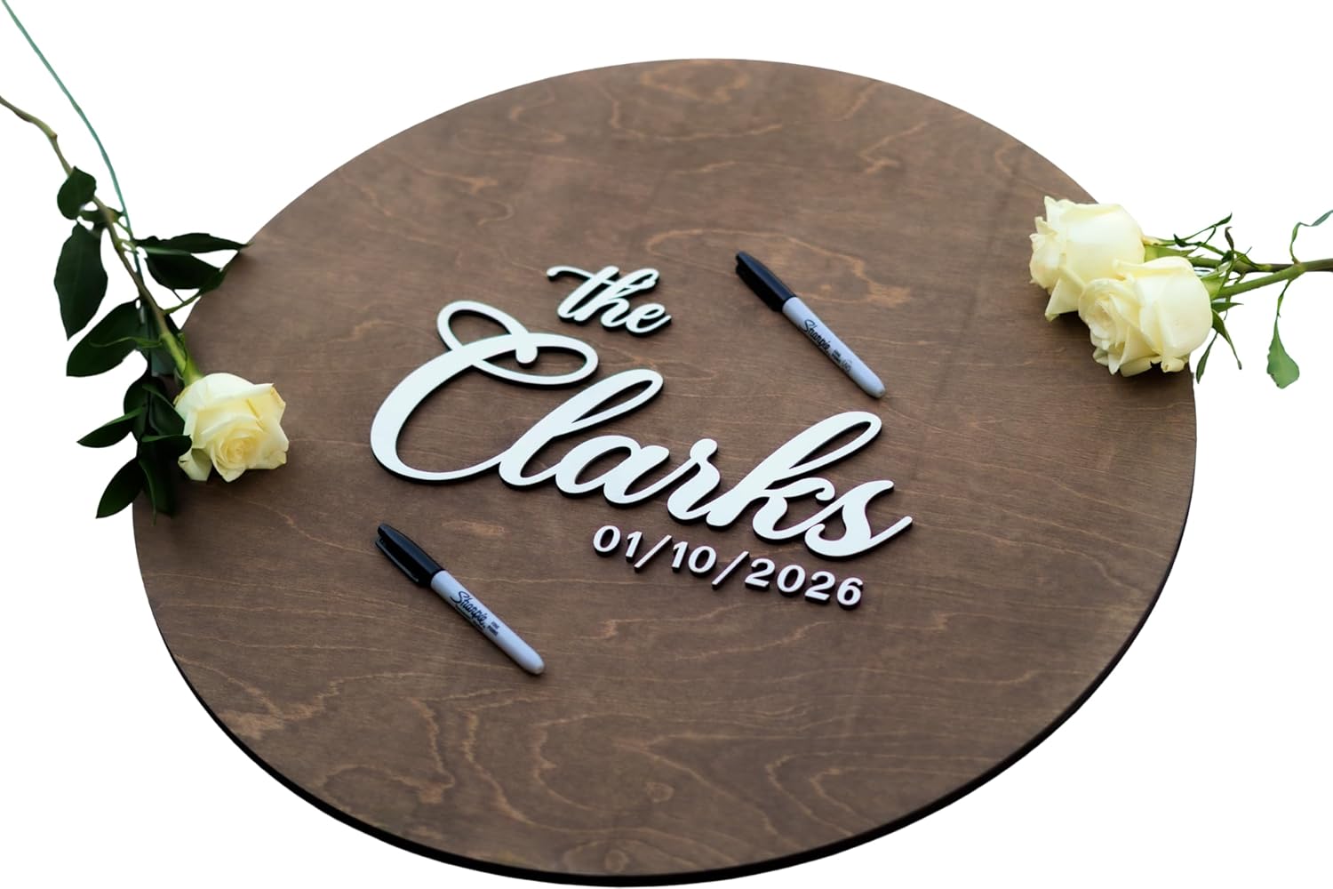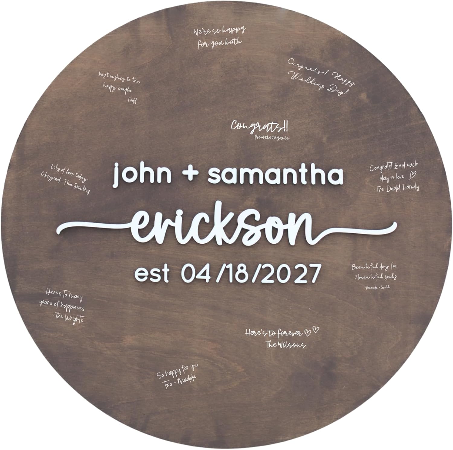 This custom 3D guest book sign makes a beautiful personalized addition to your wedding and later to your home. Raised lettering creates a rather unique 3D effect that adds depth and character to the piece. The letters are laser cut from 1/4" wood then mounted on top. Each board is hand selected for quality assurances, but the grain and stain of each sign will vary slightly since each piece is unique. SIZES: 16" circle. *Fits approximately 40-50 signatures. 20" circle. *Fits approximately 50-75 signatures. 24" circle. *Fits 100+ signatures. STAIN OPTIONS: An image above shows the current stain choices we offer to match any theme. The stain color can vary piece to piece. MARKERS: We recommend using sharpies or sharpie paint pens. (**Not Included**) LETTERING COLORS:1/4" natural birch wood, painted white, or painted black. DETAILS: The wood backboard is made from 1/2" thick premium birch wood. Name and EST raised lettering is cut from 1/4" birch wood and mounted to the board. The back of the sign will arrive stained for a finished look from all angles.