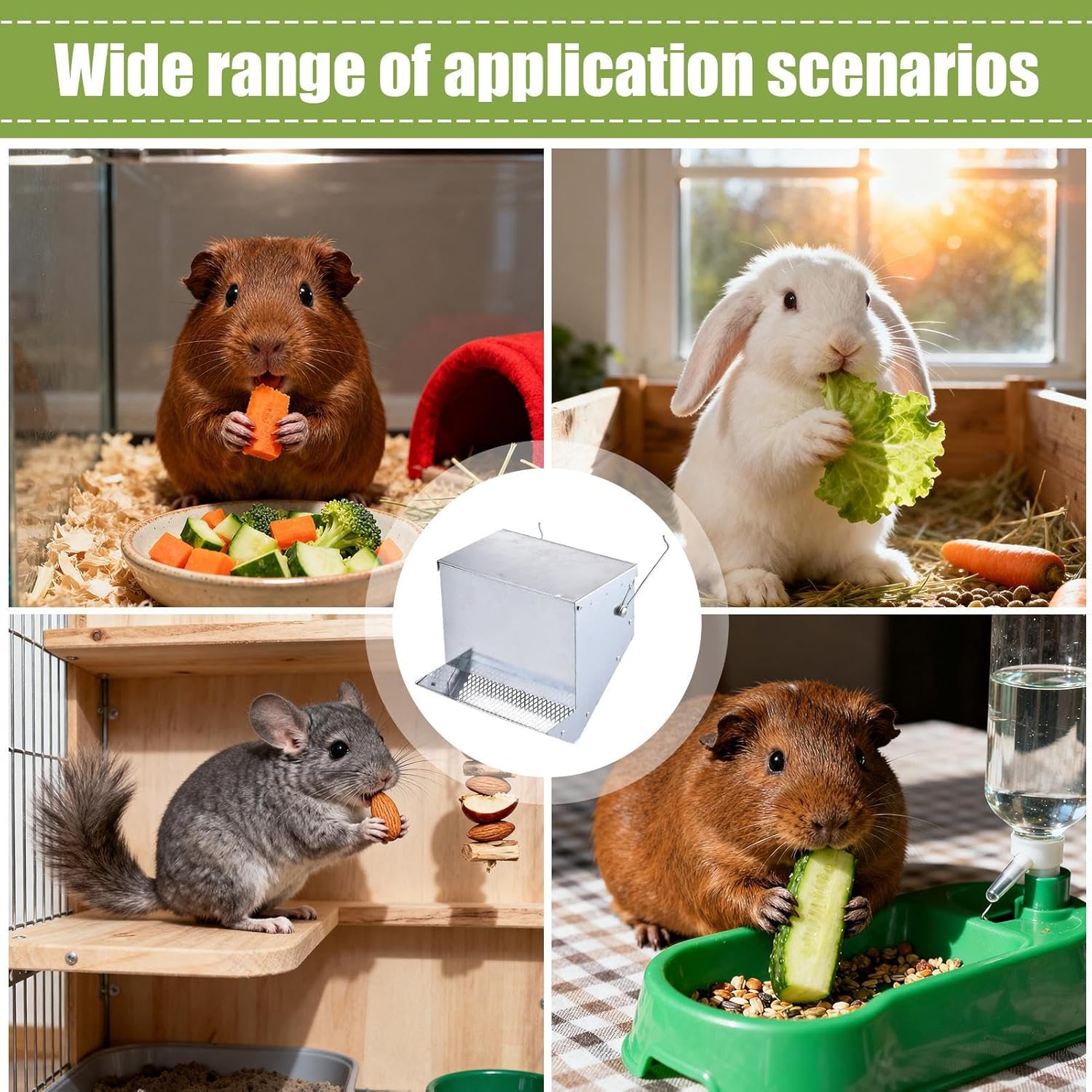 The bunny food dispenser is an innovative feeding station designed to simplify pet care for various small animals, including bird, ferret, and hamster. This automatic feeder with lid ensures food remain fresh and protected from outdoor or indoor elements. Perfect for crate training, it helps establish a consistent feeding routine while keeping your pet's area clean and organized. The versatile design suits both indoor and outdoor use, making it ideal for diverse environments. Whether you need a reliable feeding solution for your bunny or other small pets, this food dispenser offer convenience and functionality to enhance your pet care experience.Product AttributesName: Rabbit Feeder Material: Iron (Galvanized)Dimensions: Approximately 19.6 x 15 x 13.8 cm / 7.72 x 5.91 x 5.43 inProduct List1 x Rabbit Feeder Notes: 1. Due to the lighting effects and photographing angles, the product has a color difference; please understand.2. Due to manual measurement, there is a tolerance in the product size.