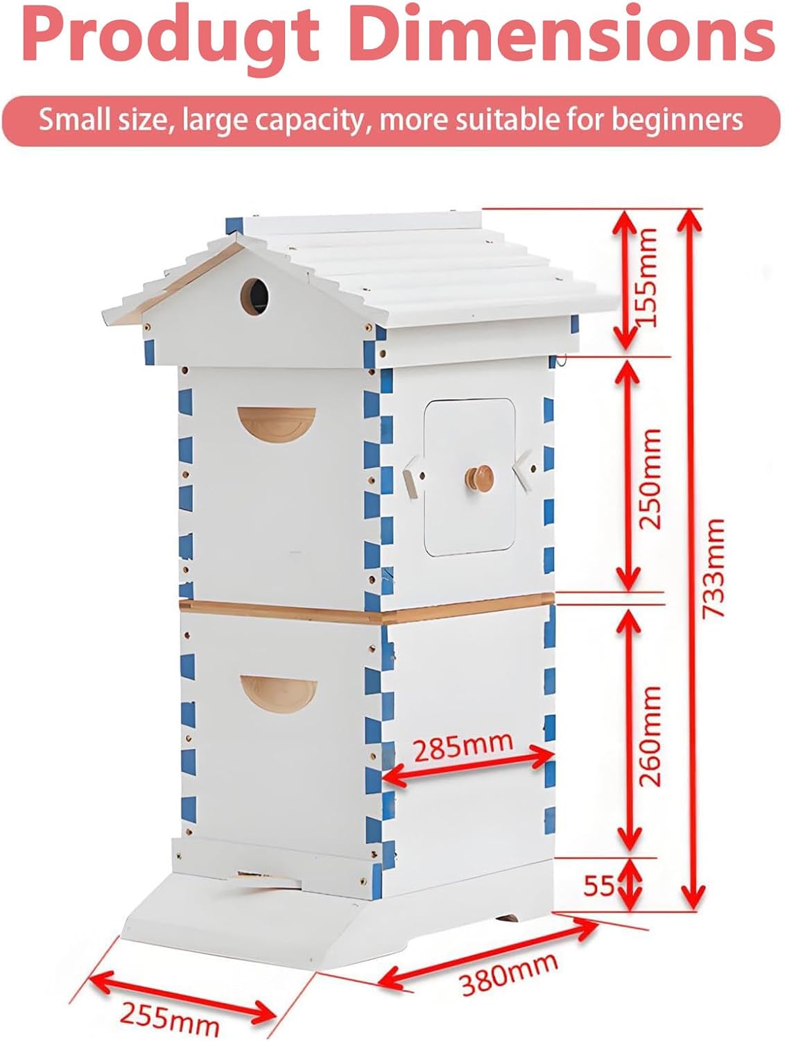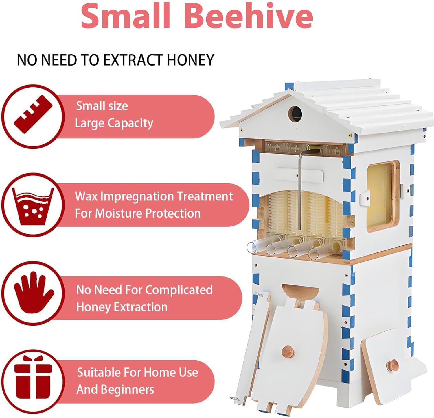 Say goodbye to messy and complicated honey extraction! Our innovative wooden beehive with a self-flow system features an integrated pouring spout that makes harvesting pure, raw honey cleaner and simpler than ever before. When your frames are ready, simply place a clean container under the pouring spout and let nature's golden flow directly into the jar.Whether you're building your first beehive, managing a nucleus colony, or simply keeping bees in your garden, this mini hive is the perfect entry point to sustainable beekeeping.➤ Product Features:- This product features a self-flow hive design, allowing for easy honey extraction through the tubes with just the turn of a key, without disturbing the bees.- Includes 4 automatic honey frames and 6 brood frames, providing effective support for honey collection and colony growth.- Compact yet spacious, with a waxed finish for superior protection.➤ Specifications:Name: Self-Flowing Beehive Starter KitMaterial: WoodProduct Dimensions: 25.5 × 38 × 71 cmPackaging Dimensions: 57 × 46 × 32 cmGross Weight: 12.5 kg➤ Package Contents:Beehive Starter Kit *1☑ If you encounter any problems with our products, please feel to contact us by email and we will resolve the issue as soon as possible.