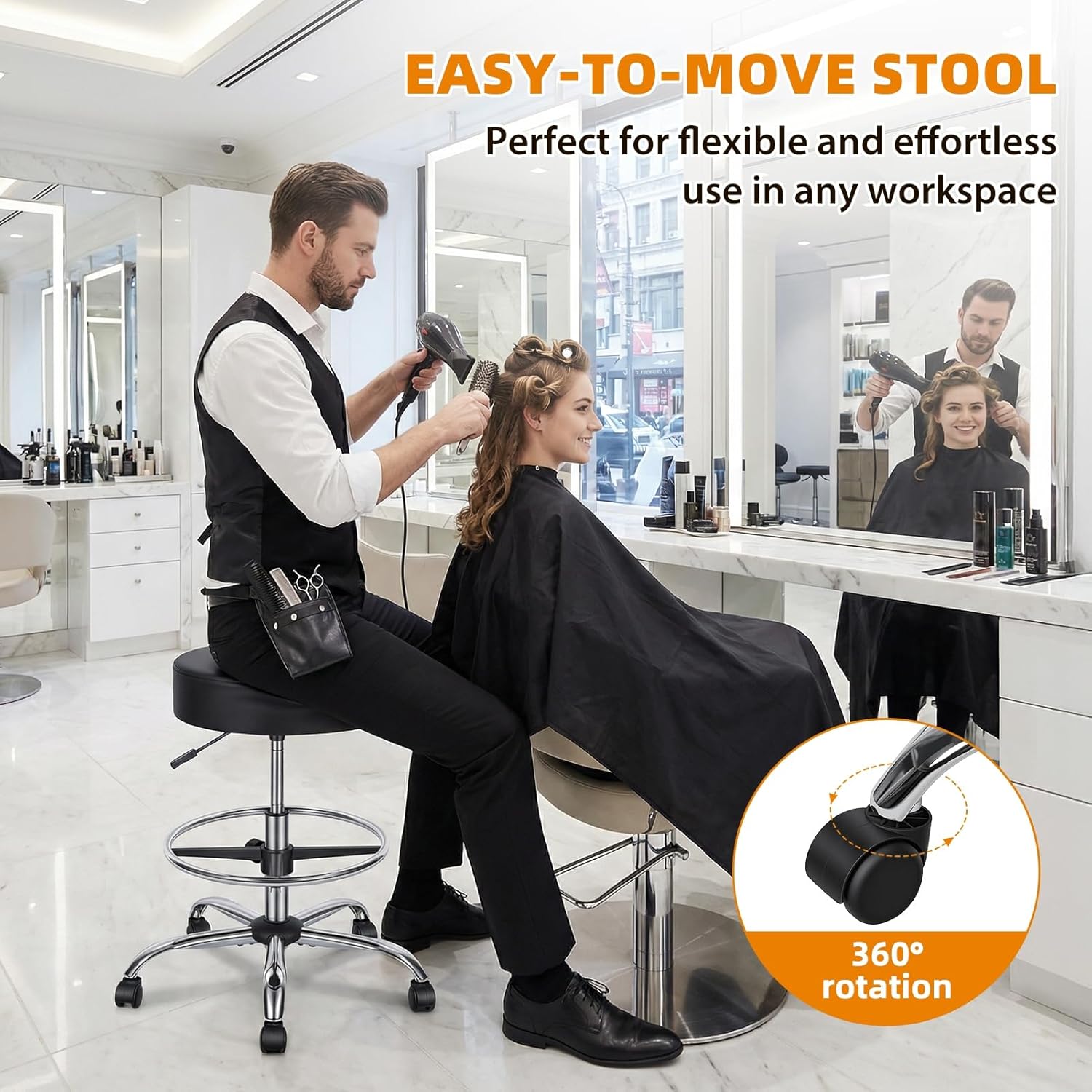 Description:This Drafting Chair with Backrest is a versatile rolling stool engineered for comfort, stability, and mobility across diverse workspaces.Featuring dual adjustable settings, the seat height adjusts smoothly from 23.6" to 32.2" using a convenient lifting lever, while the footrest ring ranges from 7.2" to 15.4"—letting you customize your position to match any desk, workbench, or user height for optimal comfort and posture support.The 15.75" round seat is wrapped in durable, easy-to-clean faux leather and padded with 3.94" thick high-density sponge, delivering plush cushioning that retains its shape even after prolonged use. Built with a robust iron plating frame and reinforced components, this stool supports up to 250lbs, ensuring reliable stability for heavy-duty daily use.The wide 5-legged base prevents tipping, and 5 smooth-rolling nylon wheels glide seamlessly across hardwood, tile, or carpet floors without scratching, enabling effortless movement between workstations. With a sleek industrial-modern aesthetic, it fits perfectly in offices, workshops, garages, kitchens, and more, catering to your diverse needs.Material: Faux Leather, Sponge, Nylon, Iron PlatingSize Details: Seat Diameter: 15.75", Thickness: 3.94"; Total Height: 35.83"-44.49"; Seat Height: 23.62"-32.2"; Footrest Ring Height: 7.2"-15.4"Note: Minor color variations may occur due to lighting/screen settings, and slight dimensional differences are possible from manual measurement.Package Includes: 1 x Drafting Chair
